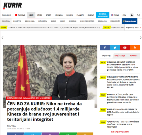 2022年8月7日,塞尔维亚主流媒体《信使报》以《任何人都不要低估14亿中国人民捍卫主权和领土完整的决心》为题,刊登对驻塞尔维亚大使陈波的专访。陈波就美国国会众议长佩洛西窜访中国台湾地区、中国是否对国际秩序构成威胁、中美关系、中塞关系及国际和地区热点问题等回答记者提问。