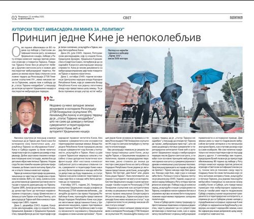 2025年10月13日,驻塞尔维亚大使李明在塞尔维亚《政治报》发表署名文章《联大第2758号决议权威不容挑战 一个中国原则不可动摇》,全面介绍台湾问题历史经纬和法理事实,批驳极少数外部势力炒作所谓“台湾地位未定”的谎言谬论,强调联大第2758号决议权威不容挑战,一个中国原则不可动摇,中方愿同塞方坚定支持彼此核心利益和重大关切,捍卫国际公平、守护历史正义,为人类和平与进步事业作出新的更大贡献。全文如下: