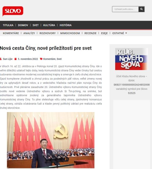 2022年11月7日,驻斯洛伐克大使孙立杰在“新话语”网发表署名文章《中国新征程,世界新机遇》,宣介中国共产党第二十次全国代表大会重要意义。全文如下: