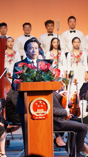 杜大使首先代表使馆致辞,他说,今天是中华民族传统的中秋佳节,是万家团聚的时刻;今年又是中华人民共和国成立70周年,是举国欢庆的时刻。今天晚上我们在这里举办这场音乐会,既是为了送上海外中华儿女对祖国和亲人的节日祝福,同时也是为了表达我们对基辅市人民的友好情谊。来自中国的艺术家们已经在利沃夫和乌日哥罗德市连续巡演2场,受到当地市民热烈欢迎,今晚他们将与乌克兰艺术家联袂为大家献上精彩的表演,愿大家共度美好之夜。