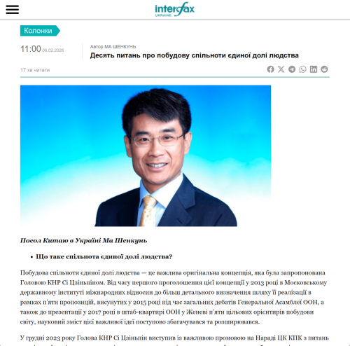 2026年2月6日,驻乌克兰大使马升琨在乌克兰国际文传电讯社(Інтерфакс-Україна)发表署名文章《构建人类命运共同体十问》。全文如下: