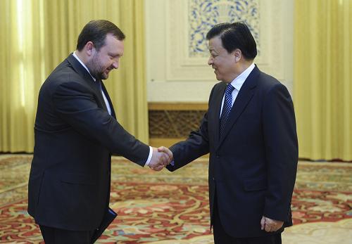 2013年9月25日,中共中央政治局常委、中央书记处书记刘云山在人民大会堂会见来华出席中乌政府间合作委员会第二次会议的乌克兰第一副总理阿尔布佐夫。
