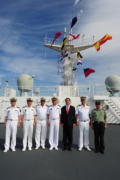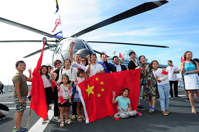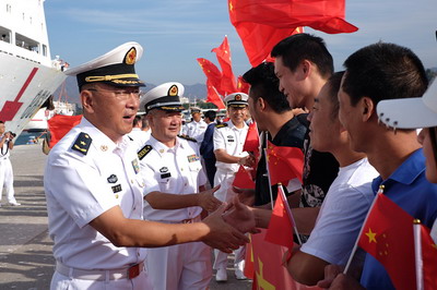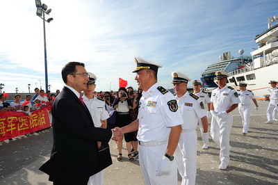 西班牙海军驻马拉加指挥官哈维尔,中国驻西班牙大使吕凡、国防武官金鸥大校,西海军官兵、中国大使馆工作人员和中资机构、留学生、华侨华人代表等300余人在码头迎接。