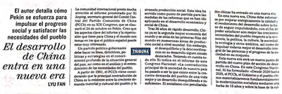 在中国共产党第十九次全国代表大会胜利闭幕之际,中国驻西班牙大使吕凡10月26日在当地主流媒体《世界报》发表署名文章——《中国未来发展跨入新时代》,全文如下: