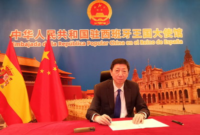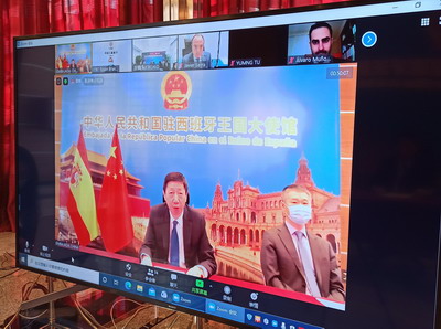 2020年9月11日,驻西班牙大使吴海涛参加中国工商银行和西班牙外贸投资促进局联合举办的第三届中国国际进口博览会(进博会)线上推介会并致辞。中国工商银行国际业务部总经理张伟武、西班牙外贸投资促进局企业国际化部总经理塞拉、马德里自治区经济与竞争力厅副厅长穆尼奥斯以及数十家西班牙企业代表参会。