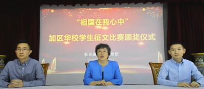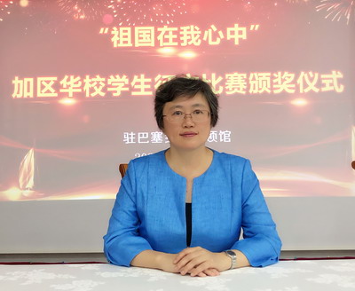 林总领事向获奖学生表示祝贺,积极评价参赛作品立意积极、内容充实、情感真挚,反映出同学们的爱国情怀和文化素质,体现了加区华文教育的积极成果。林总领事指出,新冠肺炎疫情给加区华文教育带来了冲击,但学校和师生始终坚守初心和使命,迎难而上,实现了自身的成长。林总领事强调,文化是一个国家、一个民族的灵魂。没有高度的文化自信,没有文化的繁荣兴盛,就没有中华民族伟大复兴。希望老师们切实肩负起教育华侨华人子女、传承中国文化的历史使命,希望同学们刻苦学习,守住中华民族的“根”与“魂”。