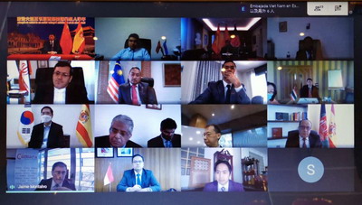 2020年10月27日,驻西班牙大使吴海涛出席亚太国家驻西使团视频会。亚太国家驻西使团长、阿富汗驻西大使罗梭主持会议,西班牙商会国际关系主任蒙塔尔沃应邀参会。