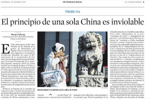 2026年1月16日,驻巴塞罗那总领事孟宇宏在西班牙主流媒体《先锋报》发表署名文章《一个中国原则不容挑战》,全文如下: