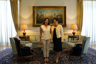 2018年6月15日,驻希腊大使夫人宁懿参赞在希腊总理府辞行拜会希总理夫人佩里斯特拉·巴齐亚娜女士,双方在轻松友好的气氛中共叙往事,亲切话别。