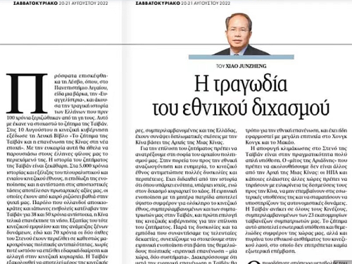 2022年8月20日,驻希腊大使肖军正在希腊主流媒体《消息报》发表《台湾问题:不能让民族割裂的悲剧重演》,介绍《台湾问题与新时代中国统一事业》白皮书,阐释中方在台湾问题上的立场和政策。全文如下: