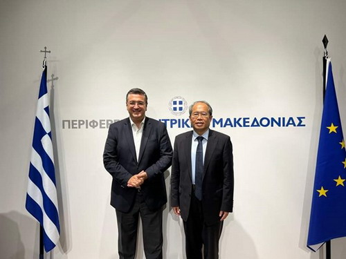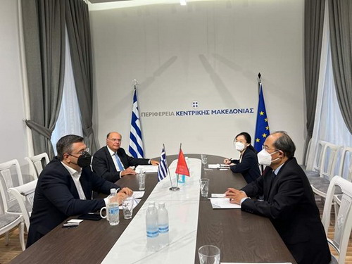 2022年10月14日,驻希腊大使肖军正在希腊第二大城市萨洛尼卡会见希腊中马其顿省省长齐齐科斯塔斯,就中希关系和两国地方间友好交流与合作等交换意见。