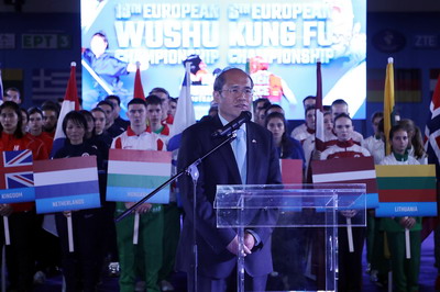 肖军正大使在致辞中表示,今年是中希建交50周年及中希文化和旅游年,在希腊举办欧洲武术锦标赛意义尤为特殊。此次活动对加强中希两个文明古国之间的交流互鉴,加深中希两国人民间的了解和友谊将发挥积极作用。武术起源于中国,但属于世界。习练中国武术能给人们带来心灵宁静,身体强健,让人们彼此信任,友爱互助。希望所有参赛选手都能享受比赛带来的乐趣,并祝愿大家取得好成绩。