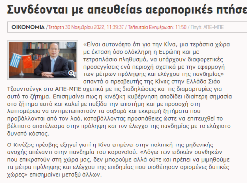 肖:中国在积极做好疫情防控的同时,尽最大努力确保对外人员交往畅通,不断恢复和加强对外交流活动,这一直是中国疫情防控的重要目标。前不久,中国政府宣布优化疫情防控工作的二十条措施,包括取消航班熔断机制,将入境人员“7天集中隔离+3天居家健康监测”调整为“5+3”,登机前48小时内核酸检测阴性证明由2次调整为1次等。这将为中国同国际社会逐步恢复交流往来提供有力保障。我们相信,疫情防控措施造成的影响是暂时的、有限的,中国将一如既往为维护全球产业链供应链的稳定畅通作出积极贡献。今年以来,中方为保障中希两国人员来往作出了许多努力。两国直航航线保持通航,中国国际航空公司还将于今年12月22日起开通上海浦东—雅典直飞航线。外国人赴华签证政策进一步优化。包括上海市、江苏省等在内的地方省市也进一步优化了入境人员防控政策。中国驻希腊使馆愿与相关希腊企业和个人保持密切沟通,提供必要协助。