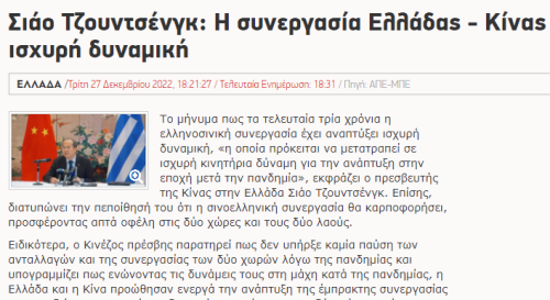 2022年12月27日,驻希腊大使肖军正接受希腊国家通讯社雅通社专访,就中国疫情防控、中国经济、中希关系等回答了提问。同日,雅通社发布了专访内容。专访答问全文如下: