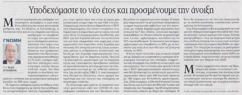 2023年1月16日,驻希腊大使肖军正在希腊主流媒体《消息报》发表署名文章《在新年的期盼里迎接春天的曙光》,介绍中国优化调整疫情防政策和中国疫情防控形势。全文如下: