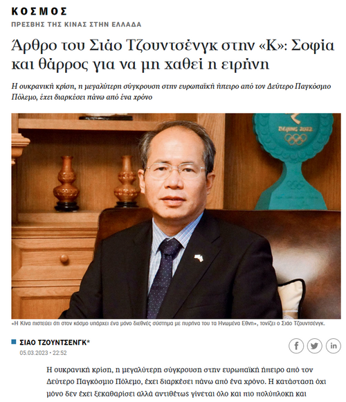 2023年3月4日,驻希腊大使肖军正在希腊主流媒体《每日报》发表《不要让和平输掉,但这需要智慧和勇气》署名文章,介绍关于政治解决乌克兰危机的中国立场,强调尊重各国主权和领土完整,重视各国合理安全关切,支持一切有利于和平解决危机的努力。全文如下: