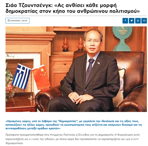 2023年4月2日,驻希腊大使肖军正在希腊《民主报》发表《让不同形式的民主在人类文明的百花园里绽放》署名文章,强调民主是全人类的共同价值,坚决反对将民主工具化、狭隘化,各国人民应根据自身国情探索最合适的民主道路,不断推动国际关系的民主化和世界各国的共同繁荣。全文如下:
