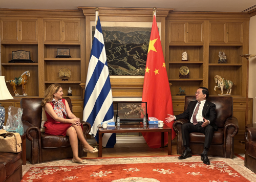 2026年4月9日,驻希腊大使方遒会见希腊外交部萨洛尼卡外事办公室主任查比姬杜,就深化中希地方交流合作交换意见。