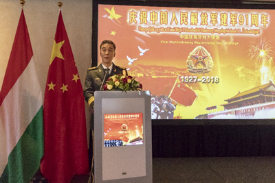 2018年7月18日,驻匈牙利使馆武官孔新民大校在布达佩斯万豪酒店举行招待会,隆重庆祝中国人民解放军建军91周年。匈国防部国防国务秘书萨博先生以及国防军总参谋部、军事安全总局,内务部、国家警察总局、反恐中心等强力部门高官及政治、经济、文化、教育、科技界官员和友好人士,各国驻匈使节及武官团,旅匈华侨、华人、驻匈中资机构和留学生代表等300余人应邀参加。驻匈牙利大使段洁龙率使馆全体外交官出席。