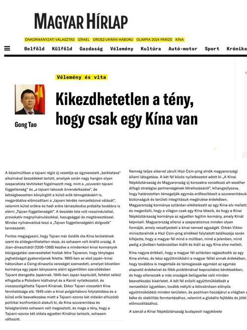 2024年6月5日,驻匈牙利大使龚韬在《匈牙利新闻报》发表署名文章《一个中国的事实不容挑衅》,全文如下: