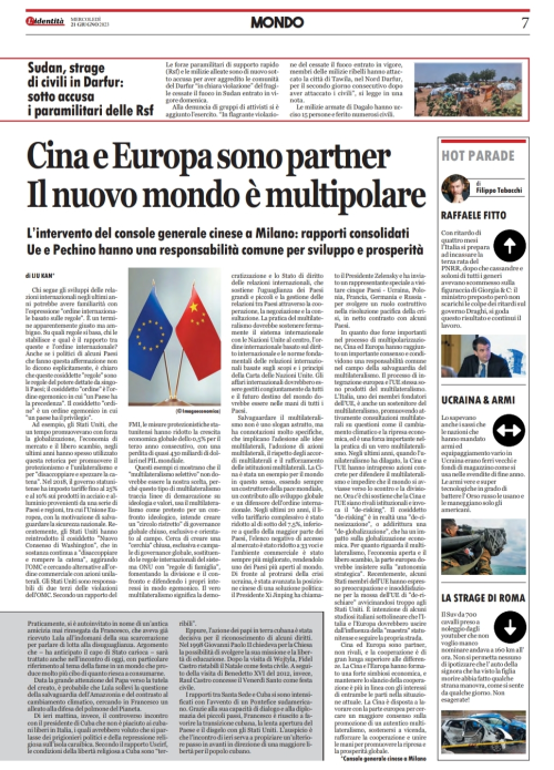 2023年6月21日,驻米兰总领事刘侃在意大利媒体《(Identita’》(伊登蒂塔)发表署名文章《中欧合作共同维护真正的多边主义》,全文如下。