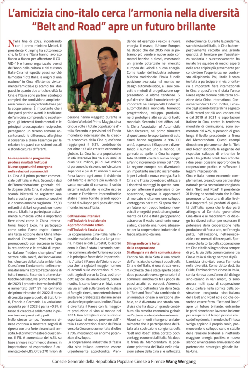 2023年6月27日,驻佛罗伦萨总领事王文刚在意大利主流媒体《第勒尼安报》发表署名文章《中意之交和而不同 “一带一路”未来可期》,宣介共建“一带一路”前景。文章主要介绍了中意两国2023年第一季度以来取得的经济成果,展望了两国在传统行业和高端产业的合作前景,阐述了“一带一路”谅解备忘录为双边关系发展带来的巨大潜力,全文如下: