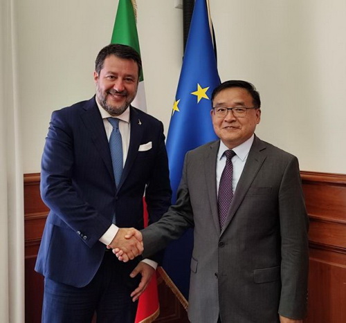 2023年7月12日,驻意大利大使贾桂德拜会意大利副总理兼基建与交通部部长萨尔维尼,双方就加强两国关系、深化基建和交通领域合作交换意见。