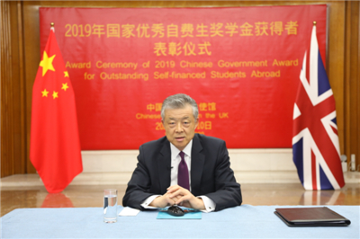 很高兴出席“2019年度国家优秀自费留学生奖学金”颁奖仪式。首先,我谨代表中国驻英国大使馆和驻曼彻斯特、爱丁堡、贝尔法斯特总领馆,向全英47名获奖同学表示热烈祝贺!同时,也向获奖同学的导师们表示衷心感谢!