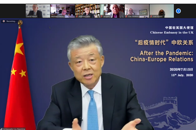 2020年7月15日,驻英国大使刘晓明在使馆与英国智库货币金融机构官方论坛、欧洲改革中心举行“‘后疫情时代’中欧关系”在线座谈会,并发表题为《携手贡献正能量,共同开创新未来》的主旨演讲。英国货币金融官方机构论坛主席马什、顾问委员会主席德赛,欧洲改革中心主任格兰特,英中贸协主席古沛勤爵士以及两家智库会员、来自英国和欧洲、北美、大洋洲、拉美等地区的经济、金融、学术界人士等共约100人参加。英国广播公司(BBC)、天空新闻台、路透社、《每日电讯报》、《金融时报》、《卫报》、《独立报》、中国国际电视台(CGTN)等中英两国媒体,以及美联社、彭博社、美国全国广播公司、法新社、保加利亚电视台等14家中外媒体派记者参加。BBC、天空新闻台对刘大使主旨演讲和部分答问进行了直播,并在当天重要时段对座谈会滚动报道。