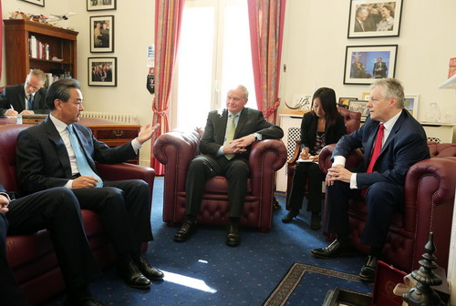 王毅说,北爱尔兰实现和平以来,历届政府及各界人士积极支持发展同中国关系,双方交往日益增多,各领域合作卓有成效。中方重视发展同北爱尔兰的关系,愿同北爱方一道,抓住今年中英关系加速发展的重要机遇,加强在经贸、投资、环保、创新、旅游等领域合作,进一步扩大北爱优质农产品对华出口,办好孔子学院和孔子课堂,增进北爱人民对中国的了解,为中英关系发展增添更多光彩。感谢北爱方对中方在贝尔法斯特设立总领馆给予支持和帮助,希望北爱地方政府继续对总领馆工作提供协助和支持。