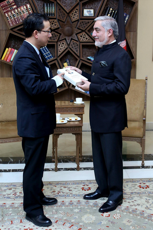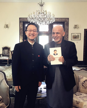2018年1月8日和10日,驻阿富汗大使刘劲松分别向阿富汗总统加尼、首席执行官阿卜杜拉赠送并介绍《习近平谈治国理政》第二卷英文版。