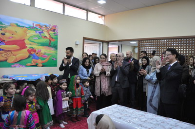 2018年1月24日,阿富汗外交部幼儿园崭新的校舍里欢声笑语不断,驻阿富汗大使刘劲松和阿黛拉副外长一道为唱歌跳舞的小朋友们打节拍,这是阿外交部幼儿园新校舍开园仪式的一幕,阿外交部第三政治司司长巴辛、行政司司长萨赫本扎达、妇女权益司司长奥斯曼、幼儿园园长瓦西达以及部分阿外交官出席了活动。