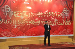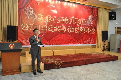 2018年2月15日,驻阿富汗使馆举行2018春节茶话会。驻阿富汗大使刘劲松和全体馆员、在阿中资企业代表、新华社驻阿记者、喀布尔大学孔子学院老师、华商协会代表以及国际机构中方员工等近百人出席。
