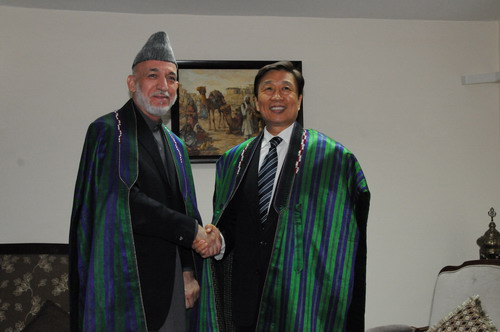 卡尔扎伊表示,中国长期以来对阿富汗友好,真诚为阿富汗着想,大力帮助阿富汗。阿富汗感谢中国真诚支持阿和平和解进程,这有利于阿富汗的稳定和安全。阿富汗赞赏中国的巨大成就,希望向中国取经。阿富汗愿永做中国的好朋友、好伙伴。