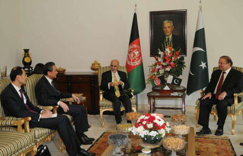 2015年12月9日,阿富汗总统加尼、巴基斯坦总理谢里夫在伊斯兰堡联袂同中国外长王毅举行三方会晤。
