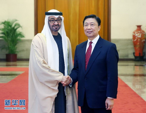 2015年12月14日,国家副主席李源潮在北京与阿联酋阿布扎比王储穆罕默德会谈。