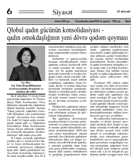 2025年10月24日,驻阿塞拜疆大使鲁梅在阿主流媒体《525报》发表题为《凝聚全球巾帼力量 开创妇女合作新局面》的署名文章,深入介绍习近平主席在全球妇女峰会开幕式上的重要讲话精神。全文如下: