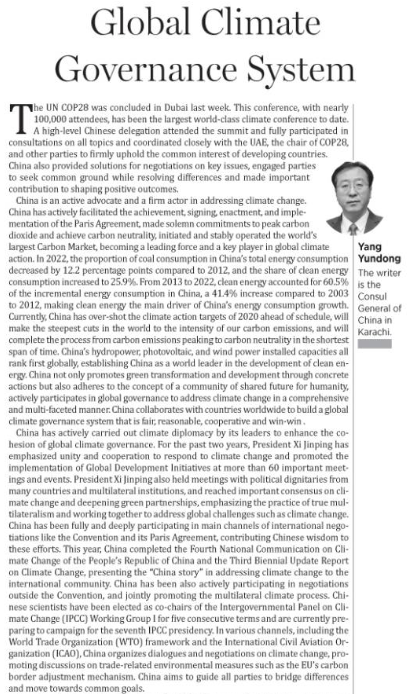 2023年12月20日,驻卡拉奇总领事杨云东在巴主流媒体《国民报》发表署名文章《全球气候治理体系》,阐述中国积极应对气候变化取得的巨大成就,介绍中国为共建公平合理、合作共赢的全球气候治理体系采取的举措以及中巴在清洁能源领域合作情况。全文如下: