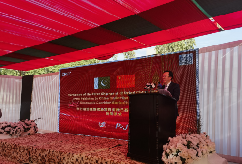 2023年12月19日,驻卡拉奇总领事杨云东出席中巴经济走廊农业项目首批巴基斯坦输华干辣椒启运仪式并致辞。信德省首席部长巴卡尔、巴植物保护部顾问阿比德,以及在巴从事辣椒种植和收购的四川丽通食品公司代表等出席。驻巴基斯坦大使姜再冬以录制视频方式表达祝贺。