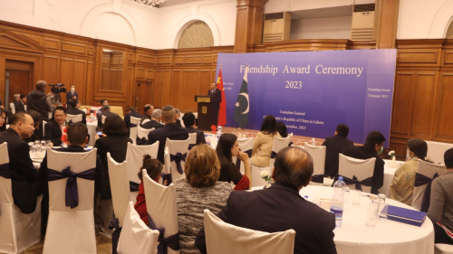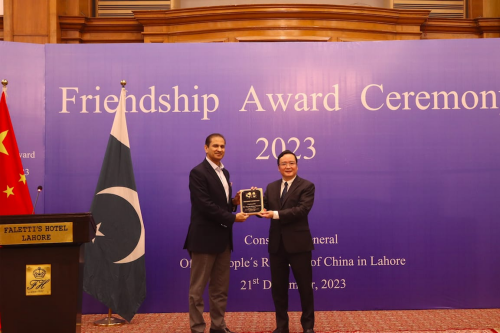 2023年12月21日,驻拉合尔总领事赵世人出席总领馆举办的2023年度“友谊奖”颁发仪式并致辞。旁省工农业部长坦维尔、内政部秘书沙基尔、警方特别保护部队司令塔伊布等70多人参加。