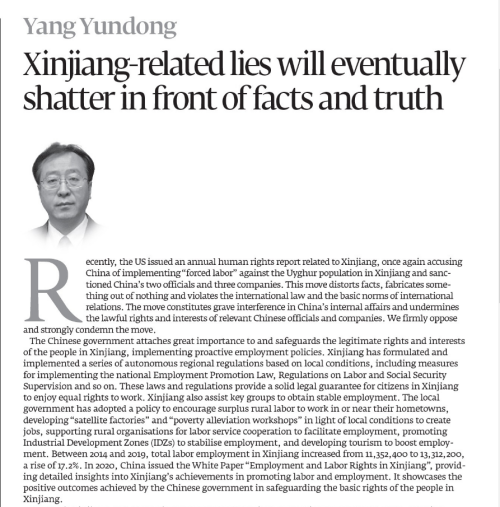 2024年1月15日,驻卡拉奇总领事杨云东在巴主流媒体《论坛快报》发表署名文章《涉疆谎言在事实真相面前终将不攻自破》,驳斥美西方有关“强迫劳动”等涉疆谎言,正面宣介中国治疆的巨大成就。全文如下: