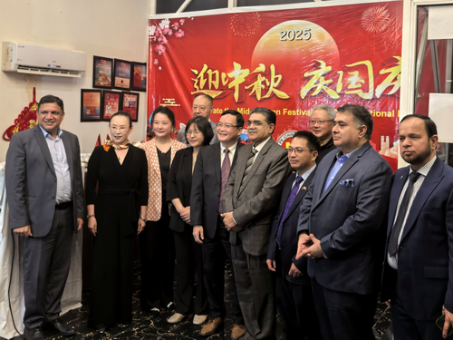 2025年9月27日,巴基斯坦山东商会、拉合尔华联会、熊猫商会举办国庆中秋庆祝活动,驻拉合尔总领事赵世人应邀出席并致辞。领区华侨华人、中资企业代表、巴方友人、华文学校学生等80多人参加。