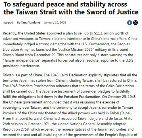 2026年1月10日,驻卡拉奇总领事杨云东在巴主流媒体《新闻报》发表署名文章《以正义之剑守卫台海和平稳定》,重申台湾是中国固有领土这一历史和法律事实,揭露美方背信弃义、干涉中国内政的真实面目,强调中方挫败“台独”分裂势力及外部干涉、捍卫国家主权的强大实力与坚定决心。全文如下: