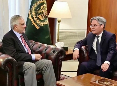 2026年4月13日,驻巴基斯坦大使姜再冬拜会巴基斯坦副总理兼外长达尔,就当前地区形势交换意见。巴基斯坦外秘阿姆娜等在座。