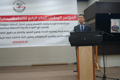 2019年9月20日,驻巴勒斯坦办事处主任郭伟应邀出席巴勒斯坦民主联盟(FIDA)第四届全国大会开幕式并致辞。