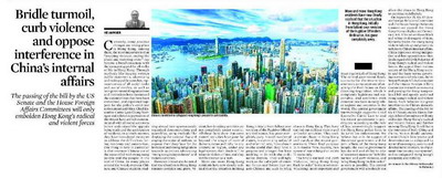 现在越来越多的香港市民已经看得很清楚,围绕修改《逃犯条例》所出现的事态已经完全变质。少数暴徒用他们的违法犯罪行为向世人表明,他们的目的和矛头所向,已与修例无关。他们心甘情愿充当外部势力和反中乱港势力的马前卒,不惜做出暴力违法的恶行,目的就是要搞乱香港、瘫痪特区政府,最终使“一国两制”名存实亡。