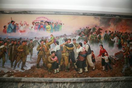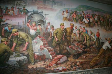 中间壁画是中国人民志愿军与朝鲜人民并肩战斗的场面:机枪愤怒的火舌、欲将跨出战壕冲锋的战士、近身的肉搏战、子弹打完后高举的石头、送弹药的妇女、抢救伤员的长者、穷凶极恶的敌人……画面右侧特别为中国人民志愿军特级战斗英雄黄继光留出了一片珍贵的区域——一位年轻战士用血肉之躯扑向敌人的枪眼。这幅画极具震撼力。画面背景是中国人民志愿军和朝鲜人民军欢庆胜利的场面。右侧壁画描述了战争胜利后志愿军参加朝鲜经济重建建设的场面,画面背景是拔地而起的崭新建筑。