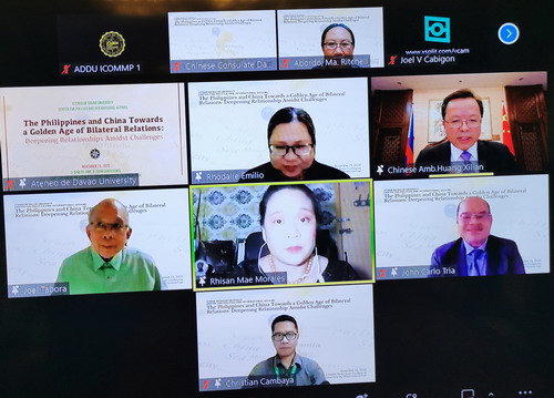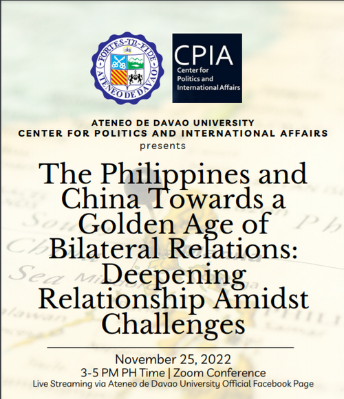 2022年11月25日,驻菲律宾大使黄溪连在线出席菲律宾达沃雅典耀大学举办的主题为“中菲关系迈向黄金时代:在挑战中深化友谊”的中菲关系论坛,并发表主旨演讲。菲达沃雅典耀大学校长塔博拉、部分国家驻菲使馆代表、菲西部军区代表、菲达沃雅典耀大学师生、智库学者等约180人出席。达沃雅典耀大学官方脸书同步直播。