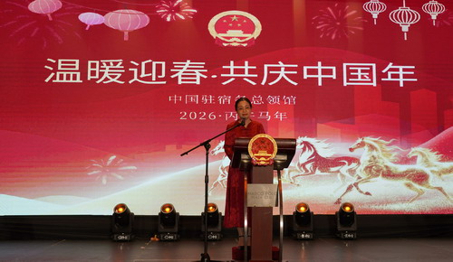 2026年2月13日,驻宿务总领馆举办“温暖迎春·共庆中国年”春节招待会,驻宿务总领事张瑱,华侨华人、中资机构、留学生及华校师生代表等约200人参加。
