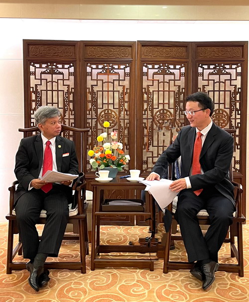 2021年11月16日至17日,外交部亚洲司司长刘劲松分别同菲律宾驻华大使罗马纳、新加坡驻华大使吕德耀、马来西亚驻华大使努西尔万、印尼驻华大使周浩黎、泰国驻华大使阿塔育、越南驻华大使范星梅工作交流,重点宣介十九届六中全会精神。